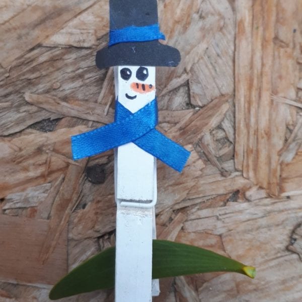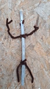 a stick, dried in the polytunnel, sprayed white, hold drilled through for the nose, pipecleaners, pen and some ribbon