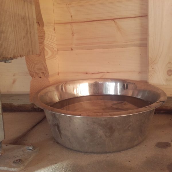 It is official, the dogs and I have now moved from the old classroom to the new visitor room. The water bowl for the dogs now has its new place and both Nellie dog and Fly dog have drunk from the bowl. The metal foot in the picture sits at the bottom of a support post and will be adjusted as the wooden building moves with time. Love the idea of a ‘living building’.
