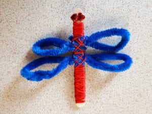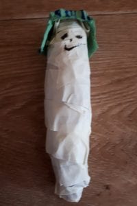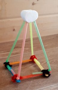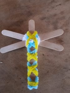 a stick, dried in the polytunnel, sprayed white, hold drilled through for the nose, pipecleaners, pen and some ribbon