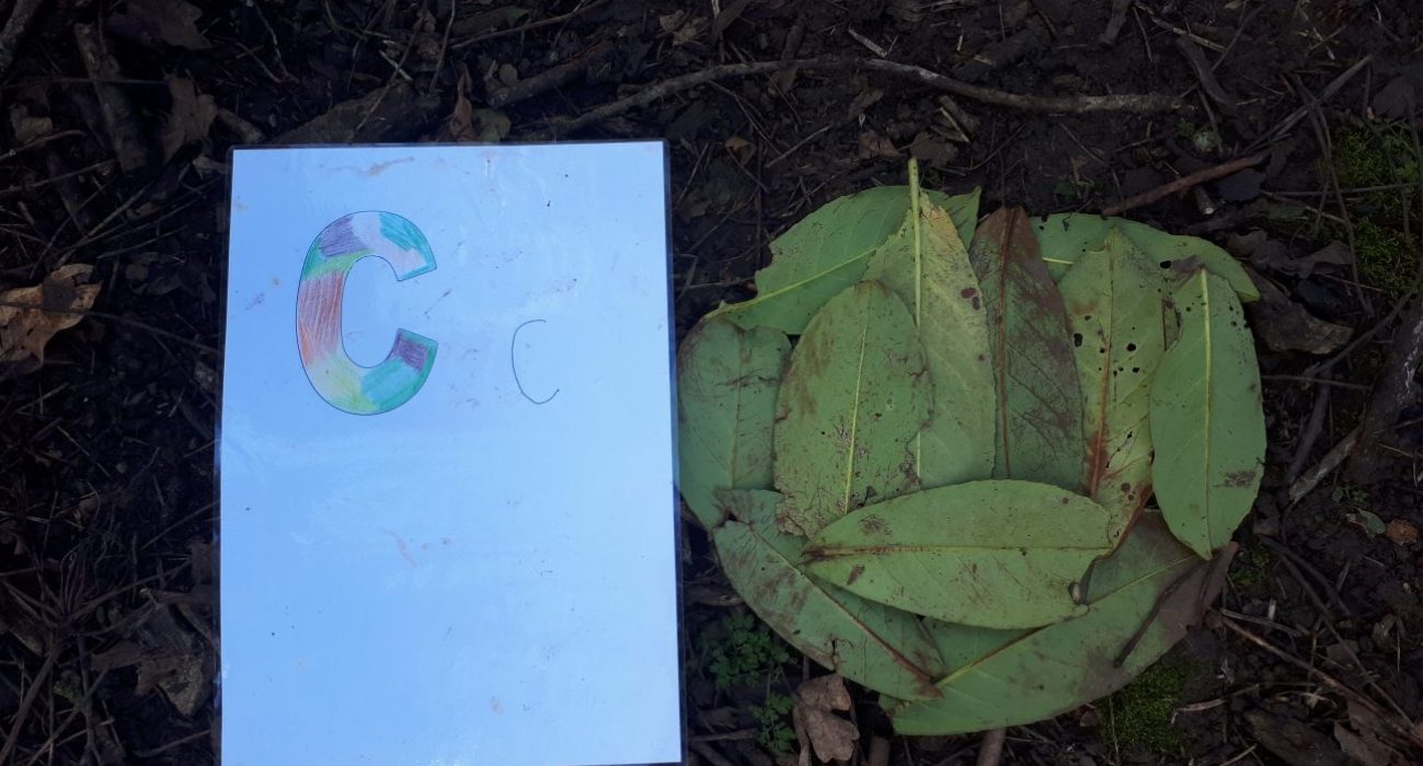 In the wood I asked the children to go into pairs and I gave each pair a letter. The children then had to think of something on the farm that began with that letter. Once they had thought of it, they had to make a picture of it using natural materials. I loved a Ladybird a boy had made but sadly the photo didn’t sure it clearly. The two photos attached to the blog are B – butterfly and C – conker.