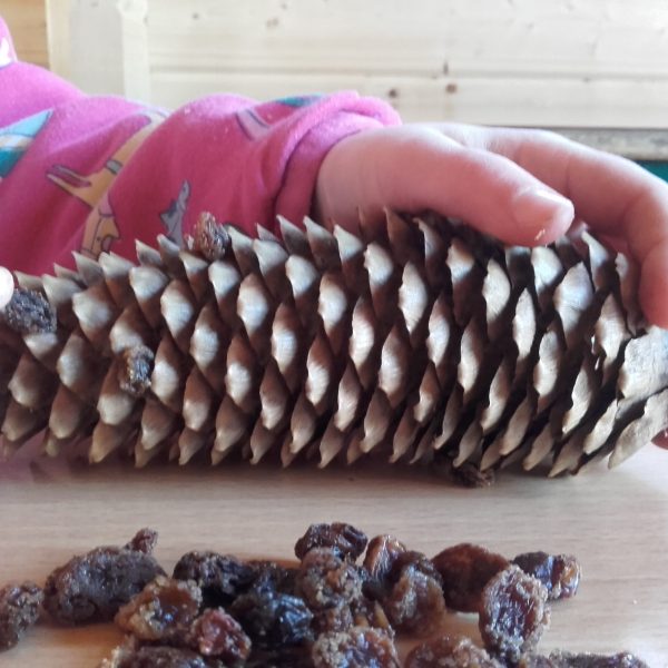 Find a pine cone, put it by the fire or a radiator for a couple of days. The pine cone will open up, as it will be tricked into thinking conditions are warm and dry enough for seed dispersal. Tie a piece of wool onto one end of the cone. Little fingers can then squish dried fruit into the cone. Once the cone is full of dried fruit, smear a layer of lard or peanut butter all over the cone. Tie onto a tree and watch the birds enjoy the food.