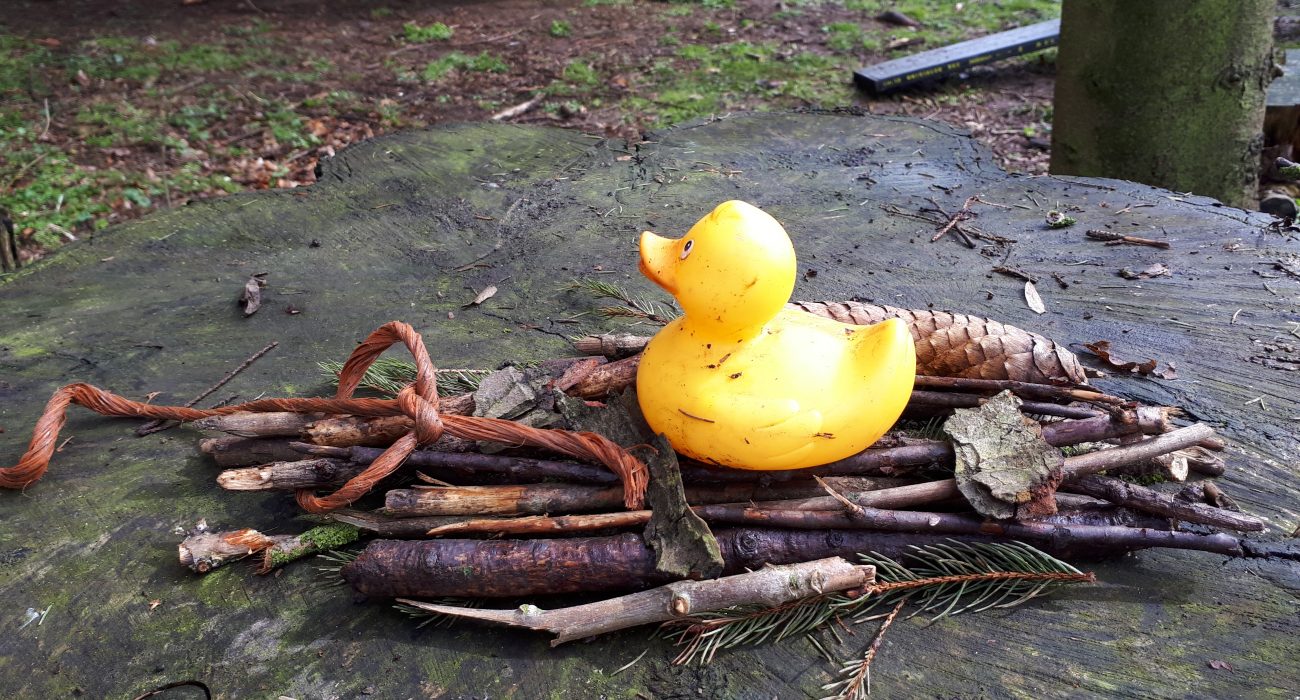We didn’t have a specific topic to cover and so it was decided that a team activity would be a fun way to spend the morning. In groups of three, the children were asked to build a raft for a rubber duck and include a rope to pull the raft through the water. The children did a really good job using natural materials in the wood and didn’t seem to notice the rain pouring down. We walked to the pond to launch the rafts. The pond is very full and lapping at the bottom of the island bridge.
