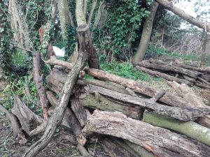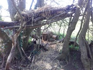 On our farm walk, we looked at a wheat crop and discussed harvesting wheat and thatching straw. The children then ran on to the Saxon Saltway which crosses the farm and so we thought about meat preservation in Tudor times. In the small wood, the children were asked to build a Tudor house and were given some straw for the roof. I was very impressed by the creative ideas of the children, as shown by the photos. After house building, we then took a walk through the orchard and into the medieval ridge and furrow land in front of the farm house. The children thought about families from the village having a ridge and growing their crops and how the Enclosures Act would have made poor rural families feel.